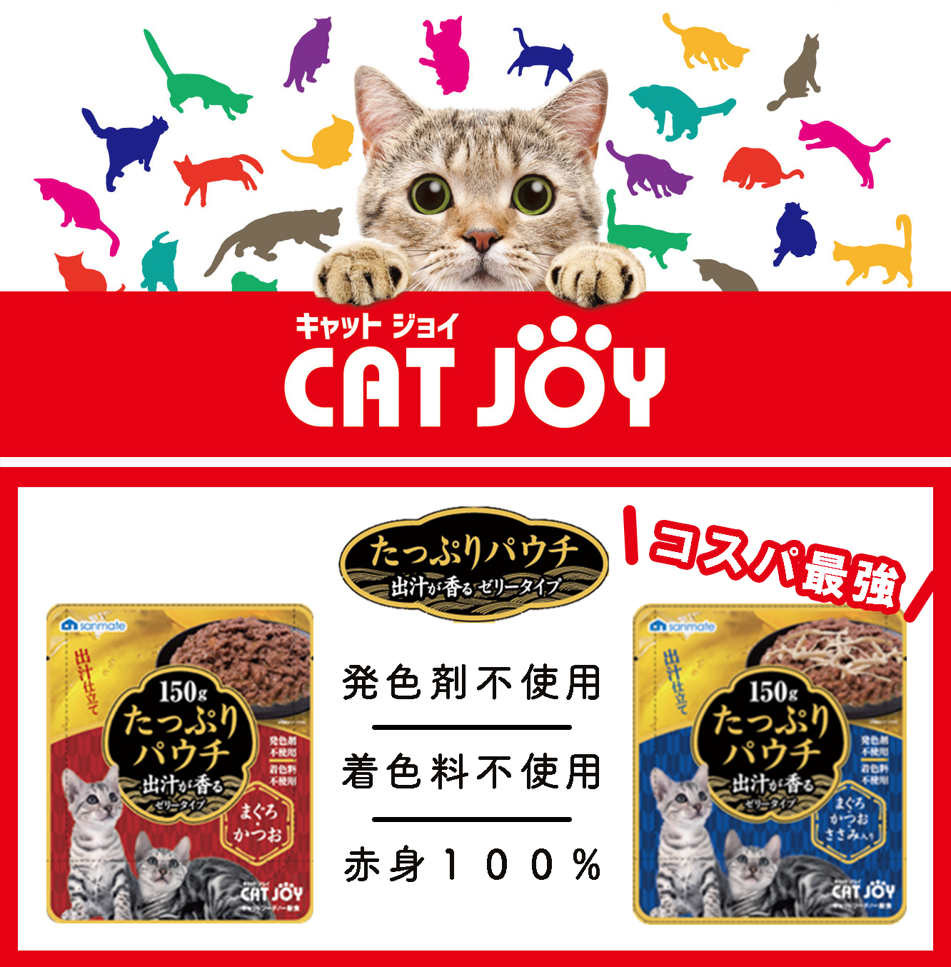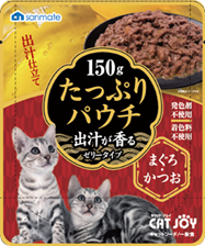 | 商品名 | CATJOYたっぷりパウチまぐろかつお 150g | CATJOYたっぷりパウチ鮪・鰹・ささみ 150g |
