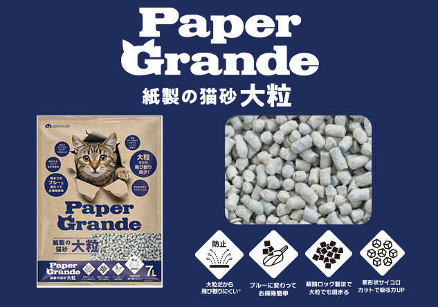 | 特徴 | 地球にやさしい紙製のねこ砂です。 ・トイレに流せる! ・しっかり固まる! ・再生パルプや再生原料を使用。エコロジーなねこ砂です。 ・ホコリがたたず清潔です。 |