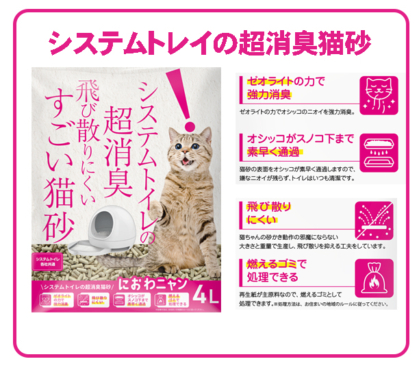 | 特徴 | ・紙でできたシステムトイレ用の猫砂です。 ・オシッコがスノコの下まで素早く通過し、ゼオライトの力でオシッコのニオイを強力消臭! ・紙なので燃えるゴミとして処理可能です。 ・使用目安::愛猫1匹の場合:2Lで約1ヵ月、 ※水洗トイレには流せません。 |