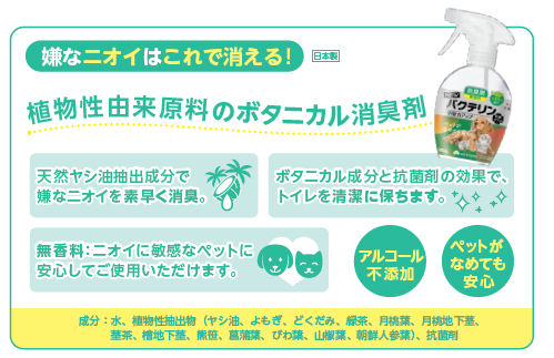 水、植物性抽出物(ヤシ油、よもぎ、どくだみ、緑茶、月桃葉、月桃地下茎、茎茶、檜地下茎、熊笹、菖蒲葉、びわ葉、山椒葉、朝鮮人参葉)、抗菌剤